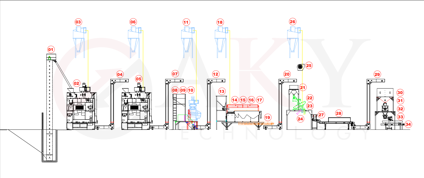 1) Sensitive Cleaning Machine; screens the dust, corp, chaff, etc. from the product and finishes the pre-celaning process. Later; for sorting the high density things, product enters to the stone separator.